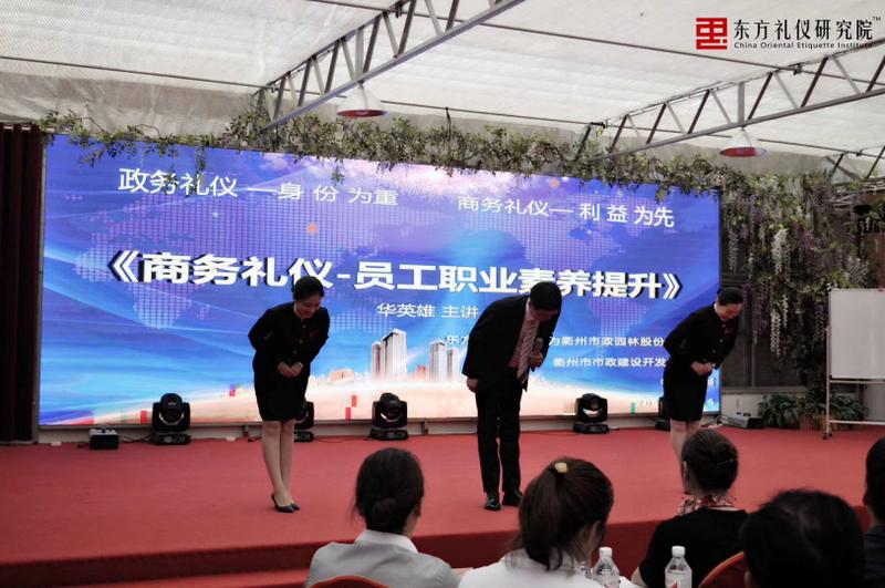 由于商務(wù)禮儀在我們的工作、生活的文明禮儀中扮演了越來(lái)越重要的角色,衢州市政園林股份有限公司邀請(qǐng)到上海東方禮儀研究院的老師們?yōu)楣締T工開展組織了一次為期兩天的“商務(wù)禮儀”培訓(xùn)。通過這次培訓(xùn)學(xué)習(xí),大家從老師那學(xué)到了很多關(guān)于商務(wù)禮儀的知識(shí)以及商務(wù)禮儀的重要性。