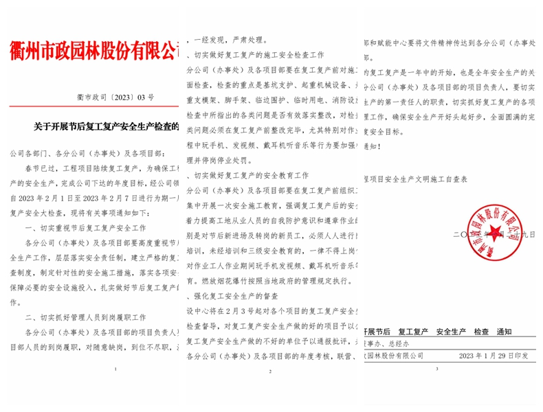 為認真落實衢州市住建局、朗尊建設(shè)集團節(jié)后復(fù)工復(fù)產(chǎn)的文件精神,切實做好2023年度節(jié)后在建項目的復(fù)工復(fù)產(chǎn)工作,我司于2023年1月29日下發(fā)了《關(guān)于開展節(jié)后復(fù)工復(fù)產(chǎn)安全生產(chǎn)檢查的通知》,要求公司在建項目重點做好管理人員到崗、安全隱患排查及整改、崗前培訓及安全技術(shù)交底、揚塵治理、以及落實工地停復(fù)工的審批程序等相關(guān)工作。